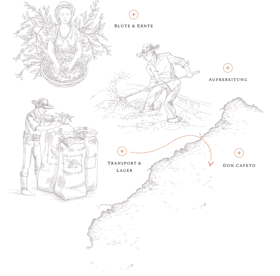 Wusstest Du, dass Kaffee eine Frucht ist? Oder besser gesagt der Samen einer Frucht. Junge Kaffeepflanzen brauchen mindestens 3 bis 4 Jahre um Kaffeekirschen zu produzieren. Da die Kaffeekirschen am selben Strauch nicht gleichzeitig den optimalen Reifegrad erreichen, werden die Pflanzen mehrmals von Erntehelfern selektiv per Hand gepflückt. Dadurch ist sichergestellt, dass nur die Kirschen geerntet werden, die den richtigen Reifegrad erreicht haben. So dauert dieser Prozess bis zu 8 oder sogar 10 Wochen.